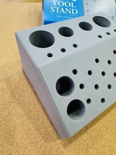 TMCツールスタンドはタイイングツールを取る時の腕の負担を軽減するためツールスタンドに傾斜面を設けました。これにより各ツールの柄がよりタイヤーに近づき、タイイング時の疲れを軽減することができます。またヘッドセメント用に水平面も設けております。